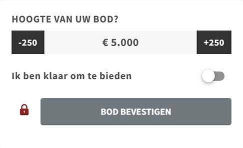 De biedstappen verhogen zich tot een biedprijs van € 10.000 telkens met € 250, vanaf een biedprijs van meer dan € 10.000 telkens met € 500 en vanaf een biedprijs van € 25.000 met € 1.000.